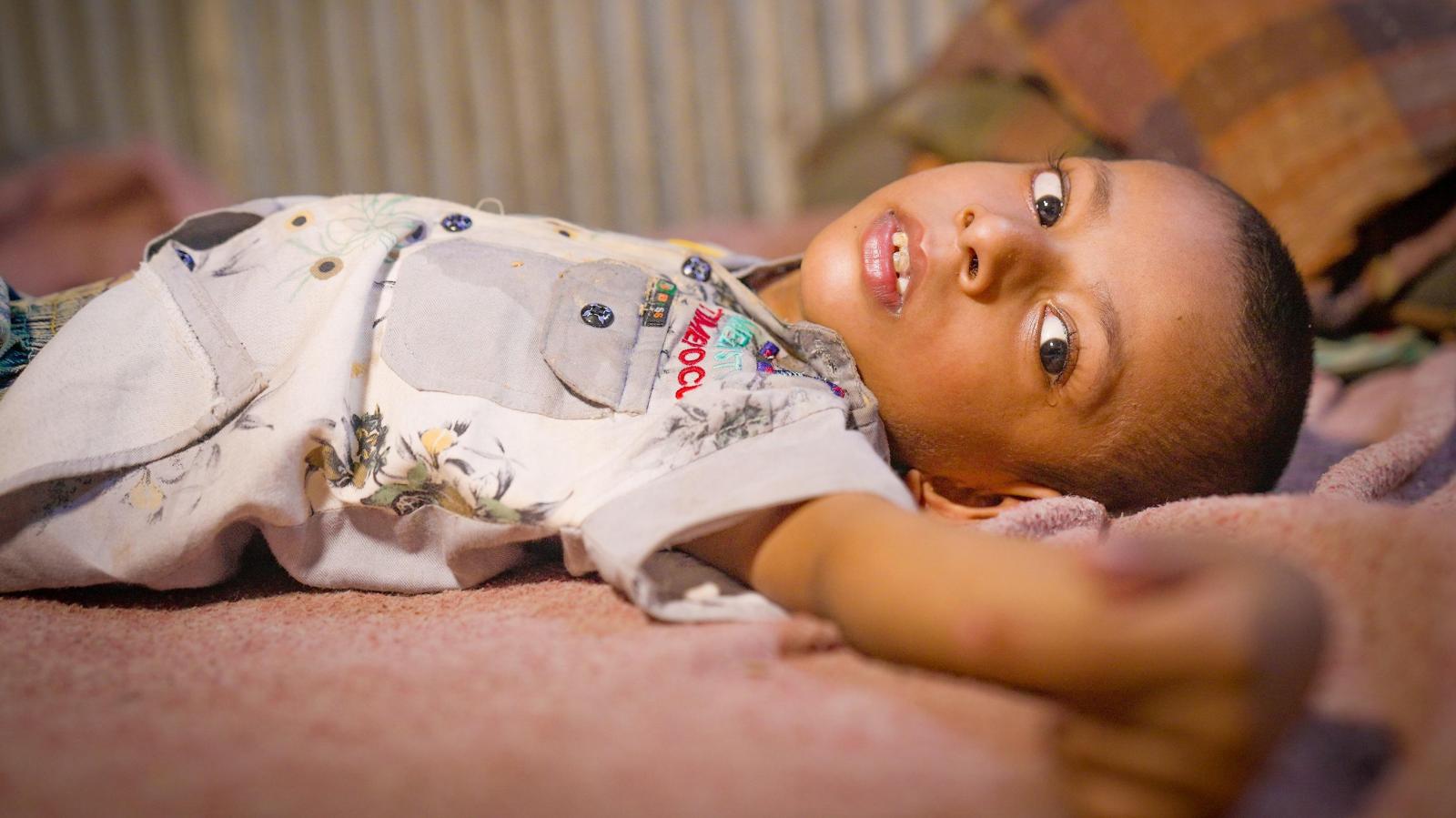Sarthak uit Bangladesh kan niet zelfstandig zitten of lopen. Zijn moeder zorgt dag en nacht voor hem, maar zonder steun is dat haast onmogelijk.